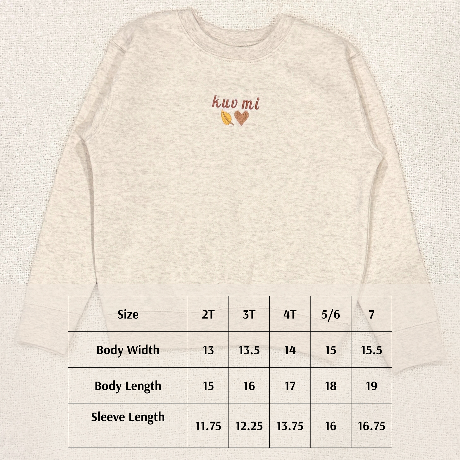 ✨ Kuv mi means “my dearest” in Hmong, and the embroidered leaf and heart symbolize nplooj siab, or “sweetheart,” making this piece both stylish and sentimental. The emojis add a playful touch to this meaningful sweatshirt!