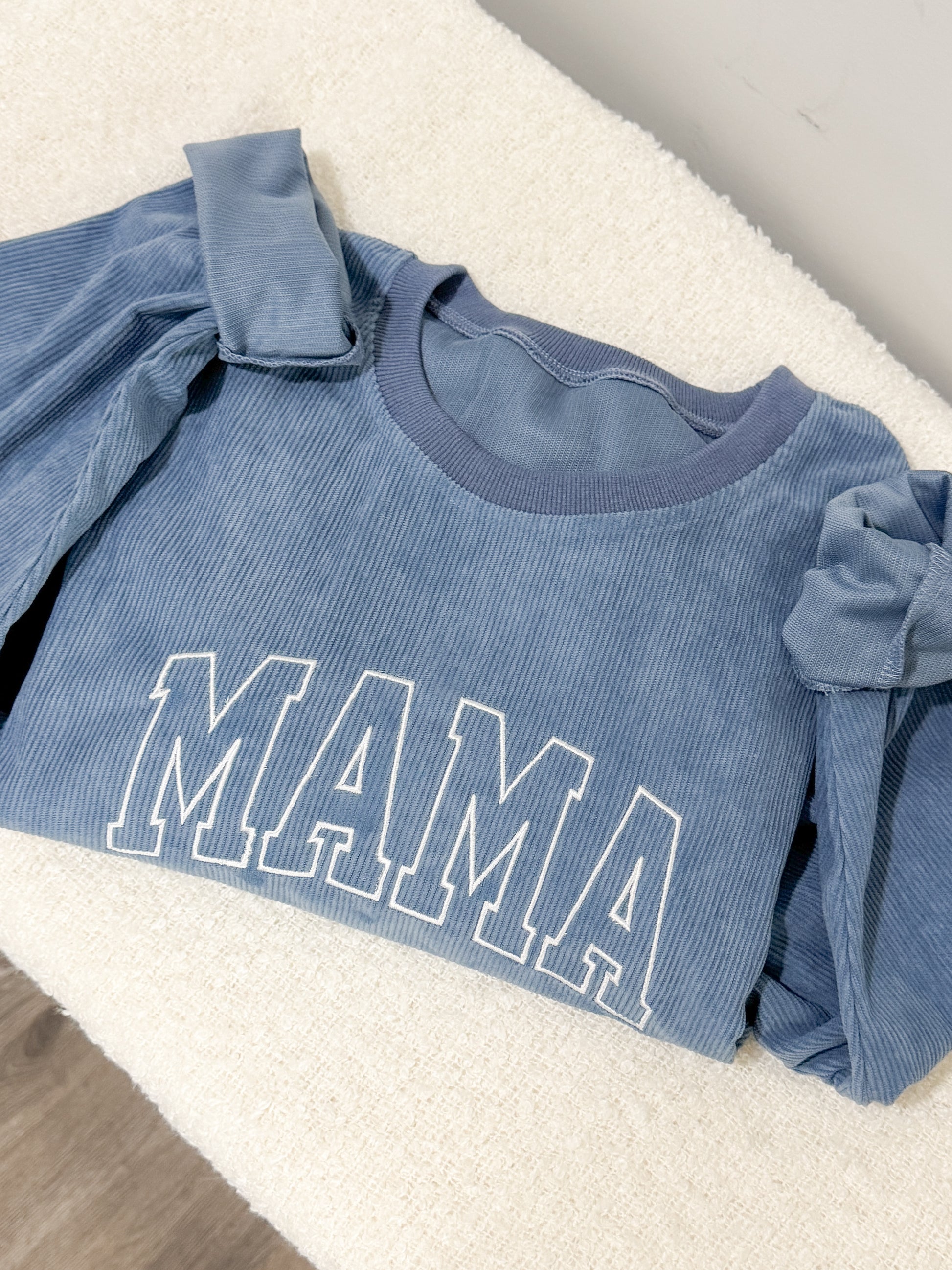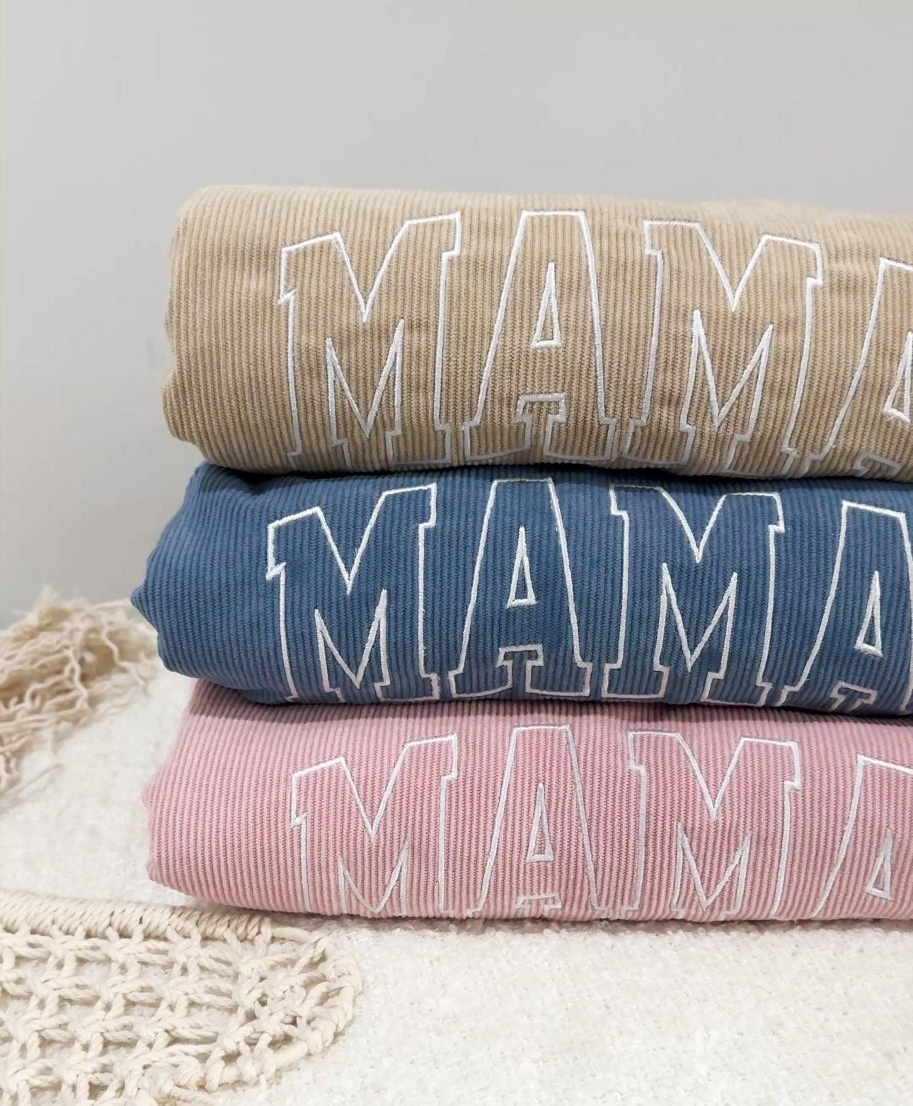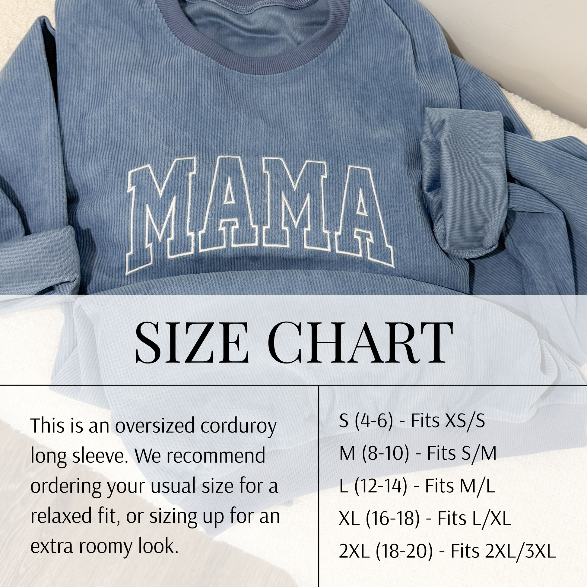 This is a popular embroidered MAMA cozy and casual oversized corduroy pullover top. Designed with a classic crewneck and long sleeves, this soft and relaxed fit is easy to style and comfortable for everyday wear. It is thin enough to layer, but also light weight enough to wear on it's own!